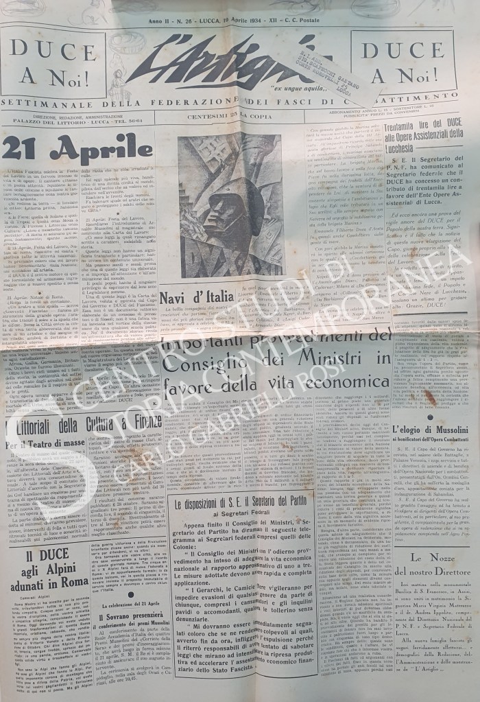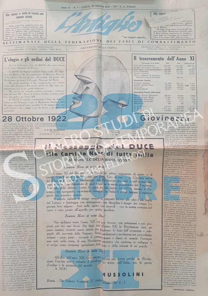 Questo giornale fascista è una preziosa documentazione delle vicende locali, nazionali e internazionali, nonché uno spaccato di propaganda di regime, corredato di foto, notizie e stralci di discorsi dei leader. I numeri fanno riferimento agli anni ’30 e in misura minore agli anni ’40 del Novecento.