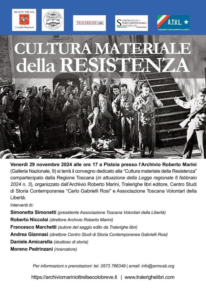 “Cultura materiale della Resistenza”, edito da Tralerighe libri, è il saggio che ha innovato gli studi sul mondo del partigianato italiano, attraverso gli oggetti materiali utilizzati dai Partigiani, di Francesco Marchetti ed è stato presentato il 29 novembre a Pistoia presso l’Archivio Roberto Marini alle 17.