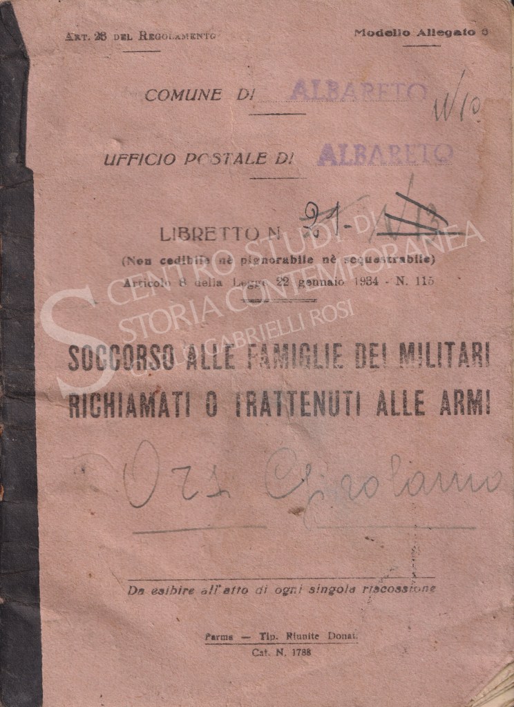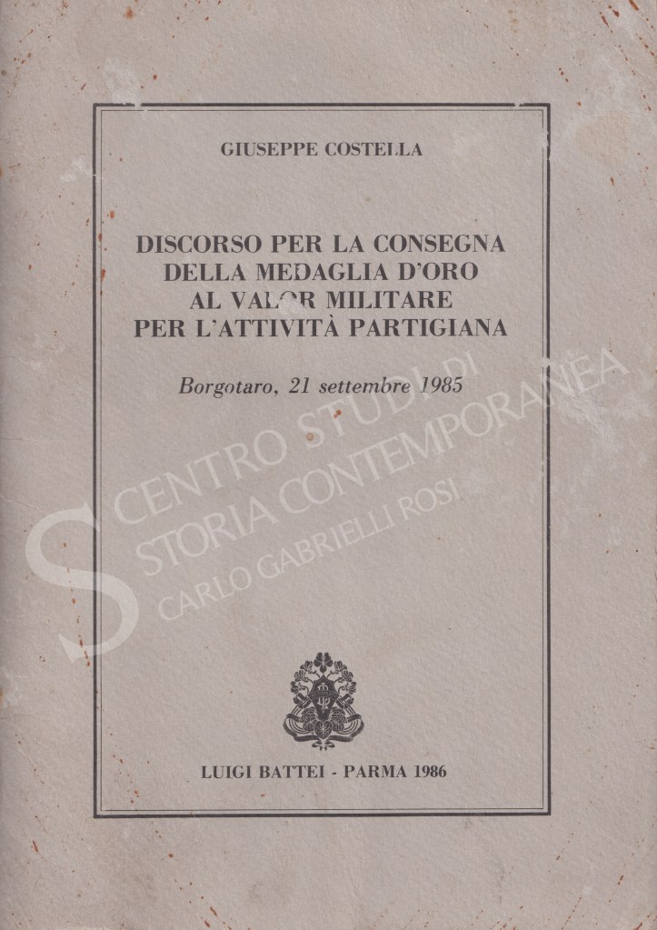 Il fondo è composto da quattro libretti militari con appunti personali manoscritti dei possessori, tre d’epoca fascista (A. Cioni, capomanipolo della Legione della M.V.S.N. “Giglio Rosso”, Vademecum del premilitare 1° e 2° anno di corso, 1927 e Col. Pericoli del 2° Reggimento Granatieri di Sardegna, Il saluto alle reclute, 1928. G. Orsi, Soccorso alle famiglie dei militari richiamati o trattenuti alle armi, 1940) e uno riferito alle decorazioni partigiane ed edito nel secondo dopoguerra, contenente anche una narrazione storica degli eventi di Borgotaro negli anni della Resistenza (G. Costella, Discorso per la consegna della medaglia d’oro al valor militare per l’attività partigiana, 1986).