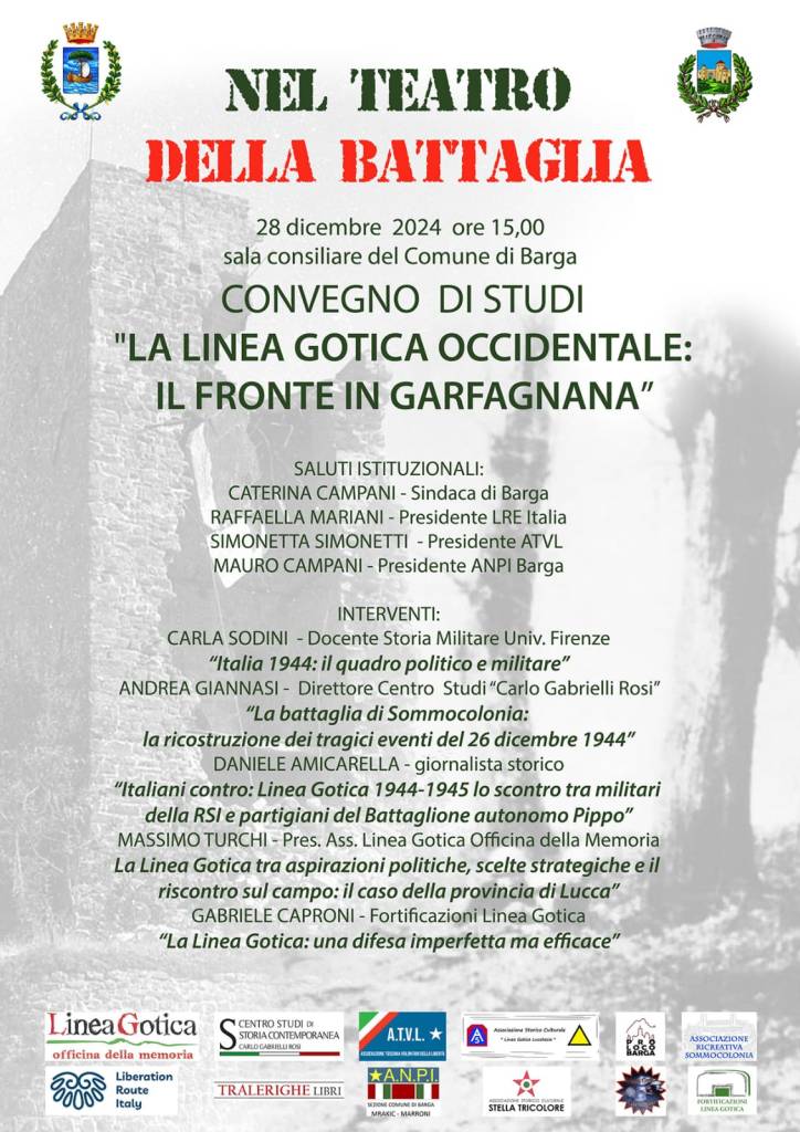 Il 28 dicembre 2024 alle 15 presso la sala consiliare del Comune di Barga si è tenuto il convegno “La Linea Gotica occidentale: il fronte della Garfagnana”. I lavori verteranno sul significato militare, sociale, strutturale, politico, economico che ha avuto la Linea Gotica sul territorio. Dopo i saluti del sindaco di Barga Caterina Campani, della presidente di Liberation Route Italy Raffaella Mariani, della presidente dell’Associazione Toscana Volontari della Libertà Simonetta Simonetti e del presidente di Anpi Barga Mauro Campani, si sono aperti i lavori con la Prof.ssa Carla Sodini, docente di Storia Militare presso l’Università di Firenze con un intervento dal tema “Italia 1944: il quadro politico e militare”; sono seguiti Andrea Giannasi, storico, direttore Centro Studi di Storia Contemporanea “Carlo Gabrielli Rosi”, con una relazione dal titolo “La battaglia di Sommocolonia: la ricostruzione dei tragici eventi del 26 dicembre 1944”; Daniele Amicarella, storico che tratterà il tema dal titolo “Italiani contro: Linea Gotica 1944-1945 lo scontro tra militari della RSI e partigiani del Battaglione autonomo Pippo”; Massimo Turchi, ricercatore storico tratterà il tema “La Linea Gotica tra aspirazioni politiche, scelte strategiche e il riscontro sul campo: il caso della provincia di Lucca”; Gabriele Caproni, con un intervento dal titolo “La Linea Gotica: una difesa imperfetta ma efficace”. Gli atti del convegno saranno poi pubblicati in un volume che sarà presentato nel 2025 in occasione della celebrazione della Liberazione e della fine della guerra.