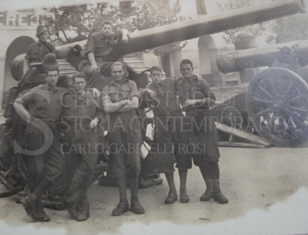In una delle foto possiamo vedere Osvaldo, il primo a sinistra, insieme ai commilitoni del 7° Reggimento Artiglieria Guardia alla Frontiera G.A.F. (un’unità del Regio Esercito Italiano attiva tra il 1937 e il 1943, incaricata della difesa delle frontiere terrestri, con batterie d’artiglieria e unità specializzate, i militari della G.A.F. avevano il cappello alpino senza la penna) con alle spalle i cannoni d’artiglieria italiani 149/35 Mod. 1910.