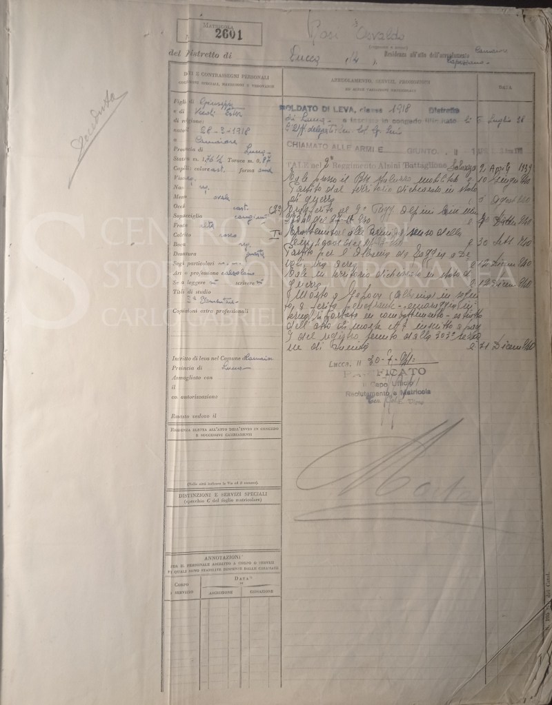 Il soldato Osvaldo Rosi nato a Camaiore, frazione di Capezzano, si arruola il 2 aprile del 1939 nel 2° Reggimento Alpini Battaglione “Salluzzo”.